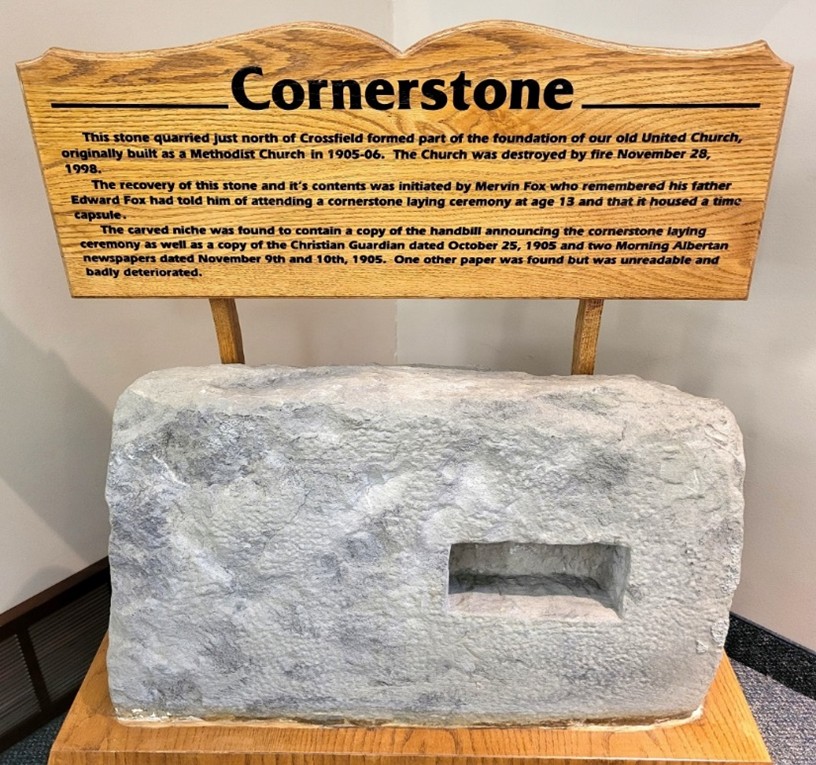 Crossfield’s earliest church consisted of a circuit preacher who led worship in both the McCool store and in people’s homes. In 1905, a Methodist church was built on Nanton Ave with a cornerstone that was quarried north of Crossfield. Crossfield decided to operate as a “union” church in 1916, with both Methodist and Presbyterian congregants. In 1925, Crossfield officially became part of the newly amalgamated denomination of the United Church of Canada.